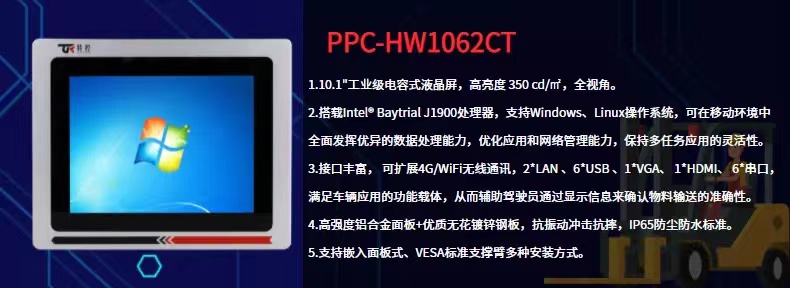 PPC-HW1062CT工業平板電腦的出現,可以讓工作人員在最短的時間內達到最高的工作效率,同時也大大減少了工作中的失誤。叉車正從一個搬運工具變成一個智能化的作業終端,具有節省人力、更安全、更可靠的優勢。