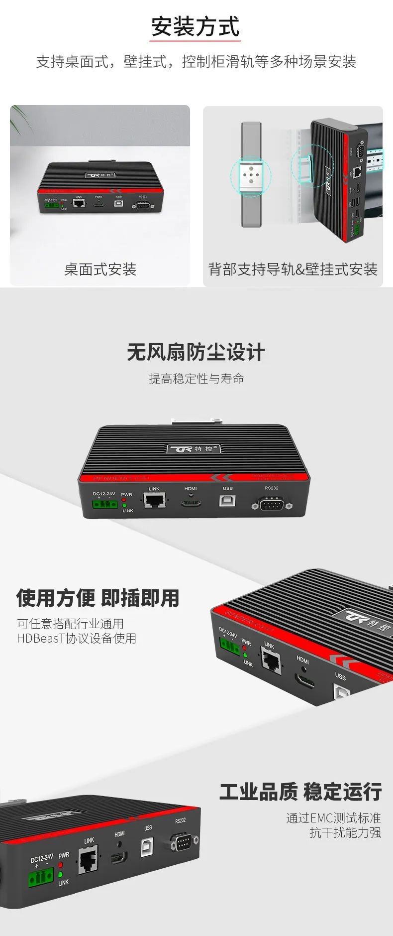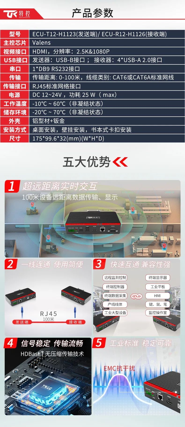 特控ECU-TR12采用進口高性能芯片設計,總體由發射端T12和接收端R12兩部分組成,發射端可將2.5k高清視頻信號、USB和RS232數據信號進行整合,通過標準網線(CAT6)遠距離傳輸到接收端,無信號衰減,接收端通過高性能智能芯片解碼,可以給用戶高速高質量的數據及顯示交互體驗,整機外殼采用鋁合金散熱設計,機身堅固小巧獨具工業美感,可搭配行業通用HDBeasT協議設備使用,包括內置協議的HMI操作端、工業顯示平板、工業PC及終端采集設備。