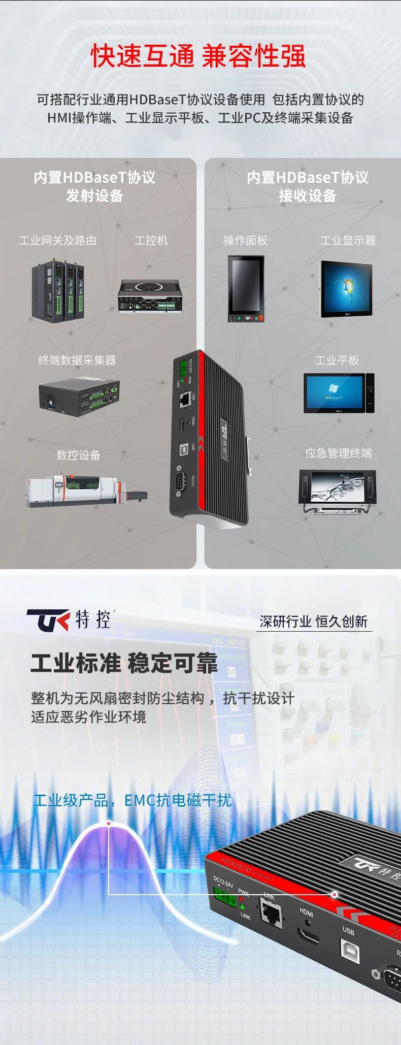 在大型裝備、自動化產線、激光及數控行業等需要遠距離信號傳輸場景中,傳統HDMI線纜存在信號衰減、傳輸距離限制、布線不便等問題,這極大地影響顯示端的成像質量和雙向數據的穩定性和時效性。為此,特控研發出抗干擾性強、數據零延時、兼容性強的HDMI星光遠傳ECU-TR12。